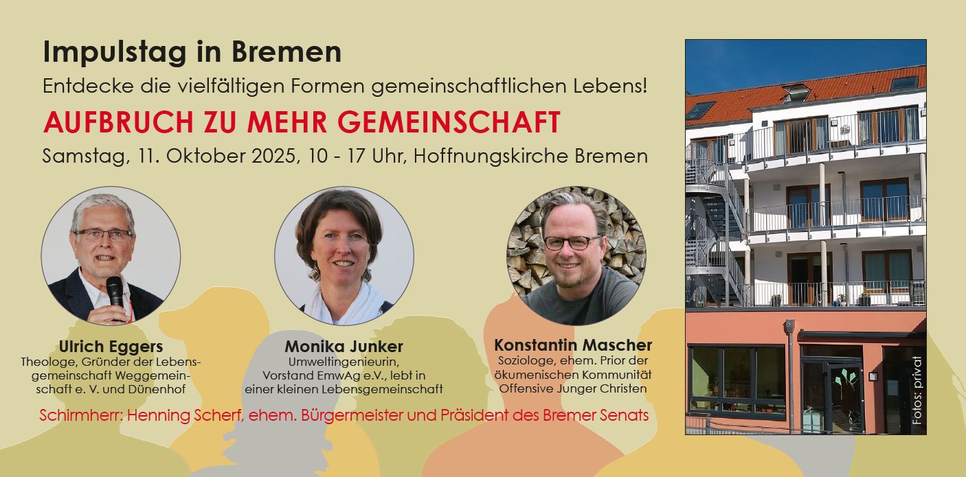 Aktuelle Zahlen sprechen von gut 20% Single-Haushalten in Deutschland mit steigender Tendenz. Unter der Schirmherrschaft des ehemaligen Bremer Bürgermeisters Henning Scherf, der selbst seit ca. 40 Jahren in einer Gemeinschaft lebt, veranstaltet die Fachstelle Gemeinschaft in Bremen am 11. Oktober den Impulstag "Aufbruch zu mehr Gemeinschaft".
