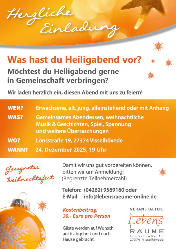 Die Heiligabendfeier findet am 24. Dezember 2025 von 19.00 bis ca. 23.00 Uhr in der Lönsstraße 19 in 27374 Visselhövede statt.